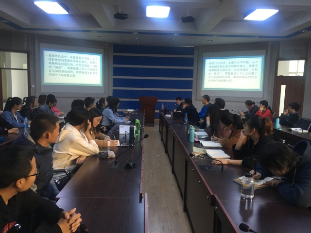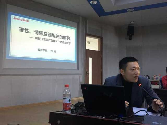 主题报告由“在一个娱乐化时代,人类如何让构建自己的政治生活,尤其是关切现实的艺术活动与人类的哲学思考及政治活动之间的关系?”的问题开始,刘斌老师以电影《三块广告牌》为例,解析了理性与情感的关系,同时还对影片中“关切现实的艺术活动”与“人类的哲学思考”的关系进行了深刻的解读,为现场师生带来一场了学术盛筵。