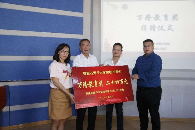 值此石河子大学校庆七十周年举校同庆之际,我校政治学与行政学专业2010届校友唐红伟、新疆万隆汽车服务有限责任公司总经理,校友高河、阿拉尔市长隆小额贷款有限责任公司总经理代表新疆万隆汽车服务有限责任公司在我校设立“万隆教育奖”,用于奖励William Hill中文成绩优异的学生和在教学、科研、学科建设、社会服务等方面表现突出的教师。
