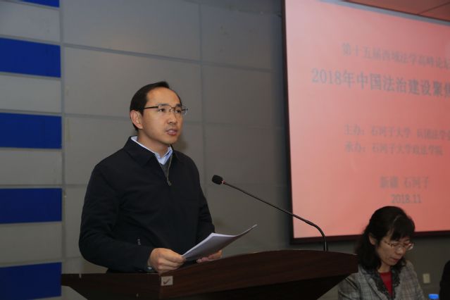 石河子大学副校长李光泗在致辞中指出“西域法学高峰论坛”已成为汇聚法学界名家,实现兵团法学理论研究与兵团法律界司法实践相辅相成,加强石河子大学对外合作交流的重要平台,极大地促进了兵团法学研究的繁荣,吸引了越来越多的学者关注新疆和兵团的法律问题,为新疆的社会稳定和长治久安,为兵团的维稳戍边和发展壮大提供了必要的法治参考。今年是改革开放四十周年和中国法治发展四十周年,在这个特殊的日子里,我们以习近平新时代中国特色社会主义法治思想为指导,如期举办第十五届“西域法学高峰论坛”,可谓恰逢其时,意义深远。