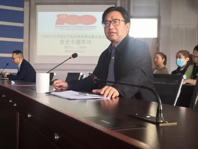 首先,王胜华老师指出学习党史的必要性和重要性,强调“以史为镜,可以知兴替”,强调“学史明理、学史增信、学史崇德、学史力行”,指出党史是最直观的党的经验的凝聚。而后,王胜华从时间脉络领学了1921—2021这100年间中国共产党光辉而曲折的发展历程,强调党史学习能够提高广大师生的政治素质、法律素质。另外,王胜华还对抗日战胜时期走群众路线的“马锡五审判方式”进行了讲解,强调“马锡五审判方式”对新时代的司法工作依然适用。