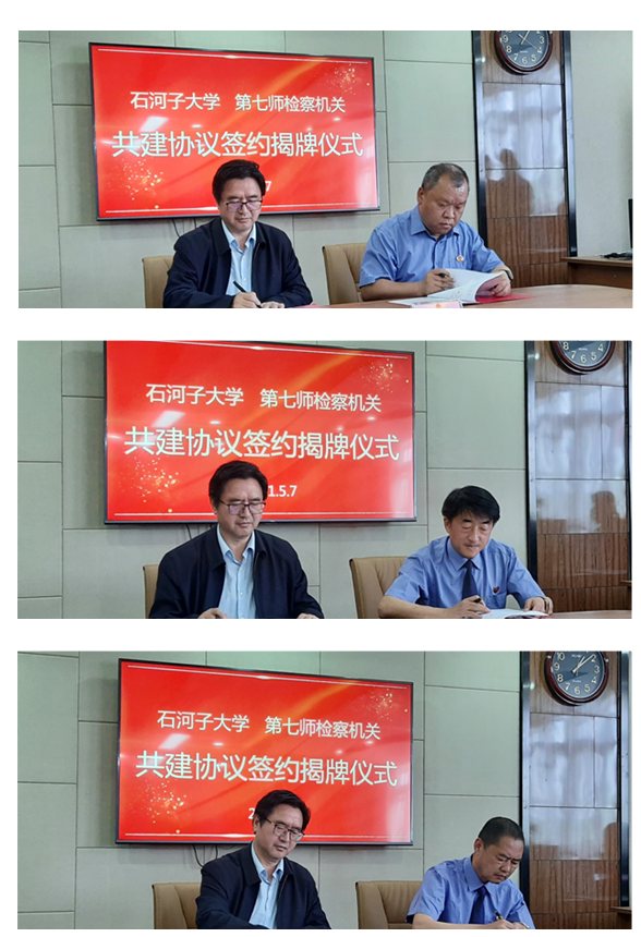 湛中乐代表石河子大学分别与兵团人民检察院第七师分院常务副检察长柴学原、奎屯垦区人民检察院检察长高阳以及车排子垦区人民检察院检察长丁勇签订“实习教学基地”共建协议。