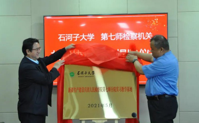 协议书签订之后,湛中乐院长和柴学原副检察长共同为“实习教学基地”进行揭牌,这标志着石河子大学和七师检察机关的合作正式确立。