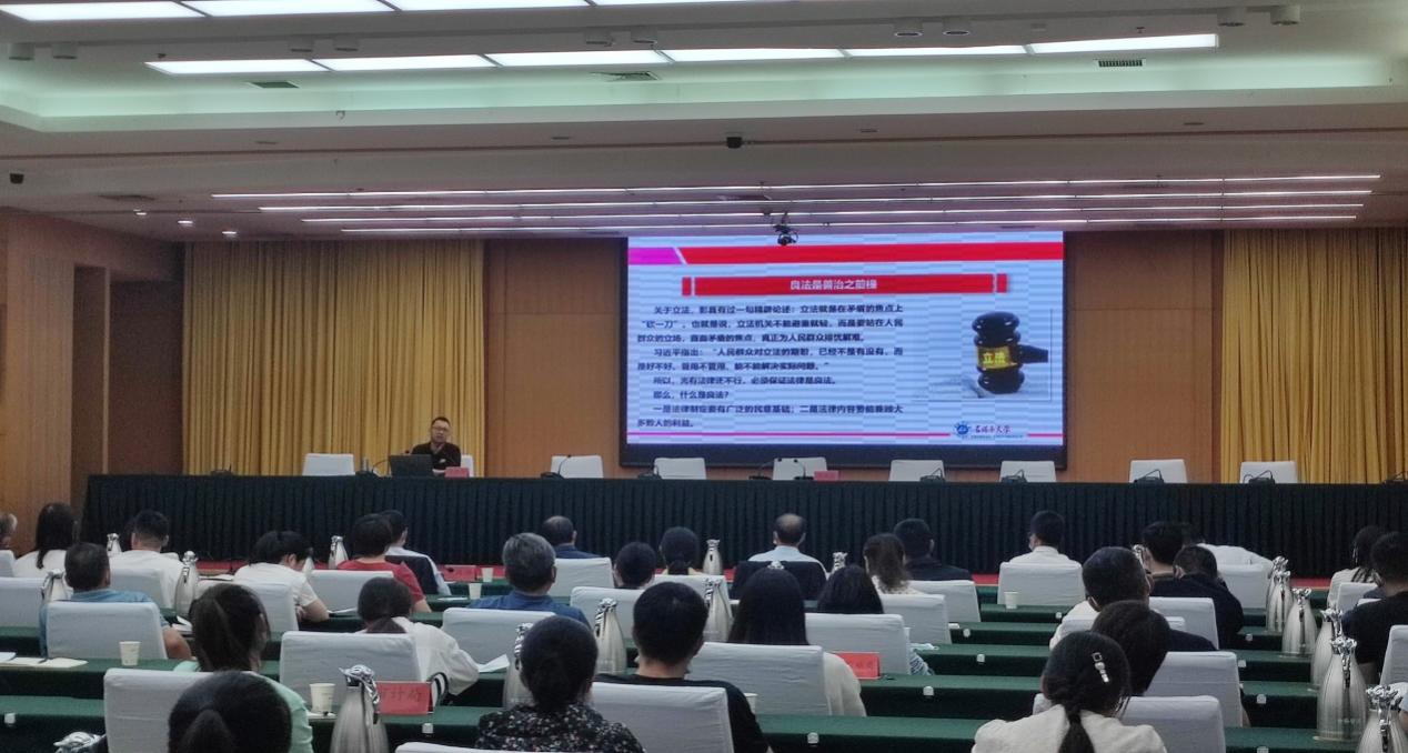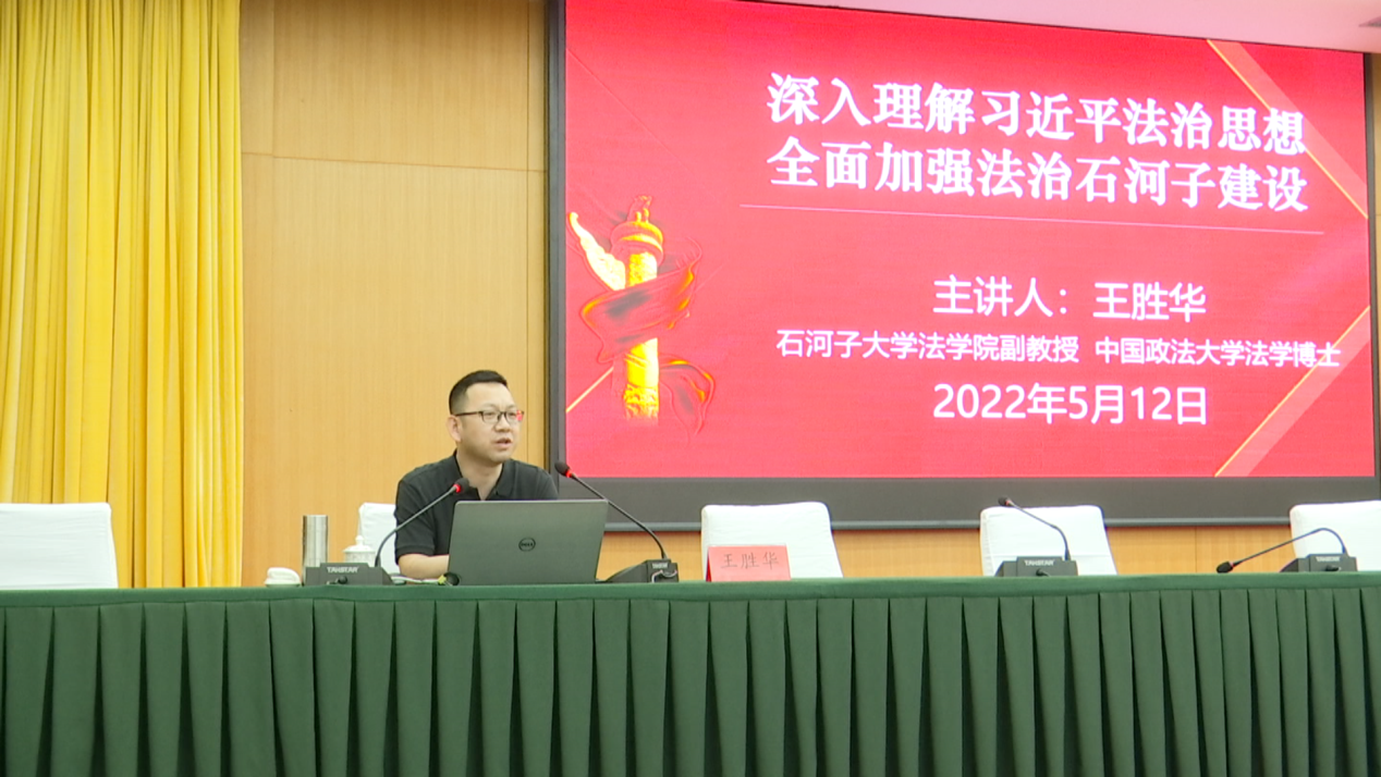 2022年5月12日,法律系师生联合党支部书记王胜华应八师石河子市党委直属机关工委、八师石河子市司法局的邀请,到八师石河子市2022年第二期“机关大讲堂”为党员领导干部120余人详解习近平法治思想。