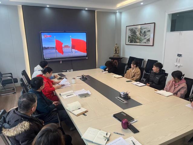 与会人员通过视频《春之声——习近平总书记出席2024年全国两会纪实》对关于高质量发展、新质生产力、数字经济以及中国式现代化等进行了再学习。