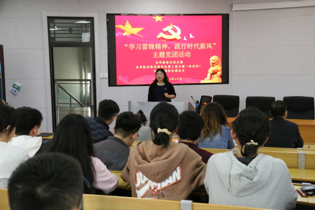 随后,法律系研究生第二党支部(非法学)支委郭雨薇同志建立在《习近平与大学生朋友们(十一)》——习书记鼓励我争做自主创新的“排头兵”》一文基础上,与大家分享雷锋故事,进一步深刻地体会和传承“雷锋精神”。通过领学习近平总书记讲的四点“掏心窝子”的话,表达出习近平总书记对当代青年的勉励和要求。郭雨薇同志说:“雷锋在为人民服务的事业中献出宝贵的生命,同时也创造了伟大的雷锋精神,几十年来,雷锋精神激励着一代又一代中国人成长,成为中华民族宝贵的精神财富。”