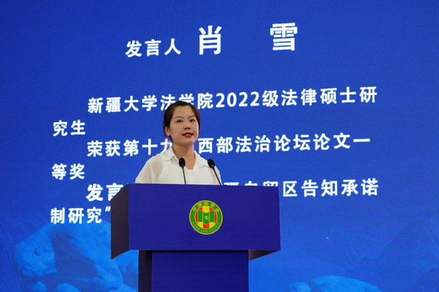 一等奖获得者新疆大学法学院2022级法律硕士研究生肖雪同学以《新疆自贸区告知承诺制研究》为题发言。她认为告知承诺制突破了传统审批方式,是经济结构转型升级的关键一环,应当理清告知承诺制的本质。告知承诺制在新疆自由贸易试验区实现减证便民的同时,也面临着缺乏上位法依据、本土化匹配度低、内容模糊、电子行政协同化需加强等内容与程序衔接困境。要建立梯度性风险结构体系,通过立法、执法、司法、法律监督四环节构建事前信用筛选、事中承诺选择、事后层次性监管相结合的新疆自贸区告知承诺制。