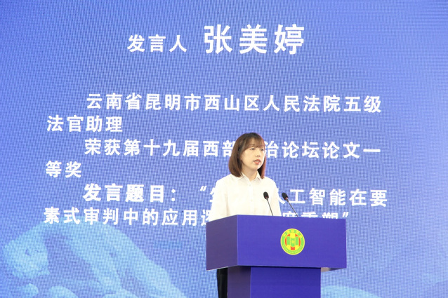一等奖获得者云南省昆明市西山区人民法院五级法官助理张美婷同志以《生成式人工智能在要素式审判中的应用逻辑与制度重塑》为题发言。她认为法院信息化建设中公正与效率的二律背反难题,需以司法理性借助技术理性之力。沿着“类案同判何以成立”理论逻辑到“类案同判何以可能”算法逻辑路径,以中国墨家辩学的比类推衍技术为切入点,证立类案同判在中华法系深厚的理论逻辑;以前馈神经网络和要素式审判的复合算法模型,证立“类案同判”的案例推理路径。进而提出以过程的透明可信原则和结果的辅助审判原则作为人工智能要素式审判的应用限度,藉由法律知识图谱的重构、大型语言模型的引入和权重系数法的应用,实现从要素规范到裁判规正的调适性修正目标。
