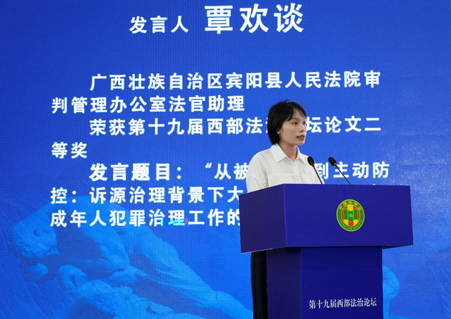 二等奖获得者广西壮族自治区宾阳县人民法院审判管理办公室法官助理覃欢谈同志以《从被动应对到主动防控:诉源治理背景下大数据战略赋能未成年人犯罪治理工作的优化路径》为题发言。她认为预防和矫治未成年人犯罪,是推动国家治理体系和治理能力现代化的重要内容。为解决未成年人犯罪近年来所呈现的低龄化、暴力化问题,法院、检察院等治理主体有意识地引入大数据技术,一定程度上有助于客观分析罪错未成年人的行为规律和特征。但数字治理仍暴露出分析不深入、资源整合不充分、发展不平衡等诸多困境。随着数字化改革的推进,有必要通过完善组织机制的顶层设计以及加强技术水平建设生命线模型,构建一体化平台等手段不断加强对未成年人犯罪的源头治理和综合治理。