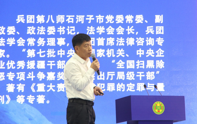 王章学,第八师石河子市党委常委、副政委,政法委书记、法学会会长作主旨发言