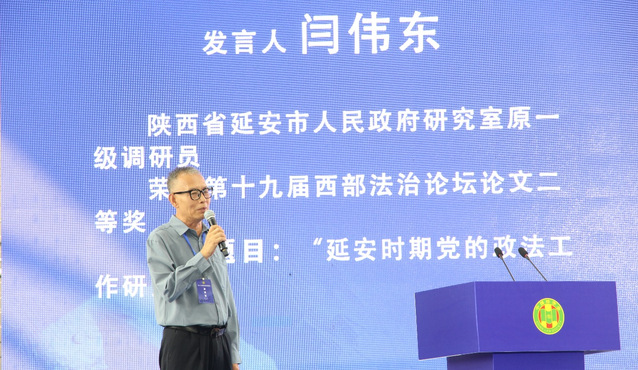 二等奖获得者陕西省延安市人民政府研究室原一级调研员闫伟东同志以《延安时期党的政法工作研究》为题发言。他认为在“一元化”领导体制下,按照“民主集中制”原则,延安时期党对所有政法工作单位实现了坚强有力的领导。在陕甘宁边区,从组织层面来说,中央书记处和西北局、边区政府党组(党团)是政法工作单位的核心领导机关。从具体担负领导职责来说,毛泽东、任弼时、林伯渠是政法工作单位的核心领导人。特别林伯渠,是陕甘宁边区政法工作单位的直接领导人。延安时期在党的领导下,陕甘宁边区政法工作改变了旧法令实行了革命的新法令,逐渐走向成熟,步入了规范化法制化轨道、奠定了新中国政法工作基石。延安时期党领导下的陕甘宁边区政法工作丰富实践和经验,形成了政法工作的优良传统,孕育了政法工作不变红色基因。