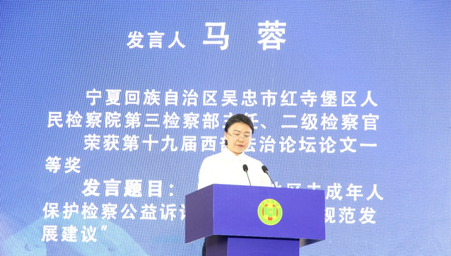 一等奖获得者宁夏回族自治区吴忠市红寺堡区人民检察院第三检察部主任、未检部门负责人、二级检察官马蓉同志以《论西部地区未成年人保护检察公益诉讼的重点领域及规范发展建议》为题发言。她认为对未成年人进行有效的司法保护,是我国检察机关的神圣职责。他在对未成年人保护相关概念和利益进行辨识的基础上,探讨了未成年人保护检察公益诉讼的范围及可以重点开展的领域。认为未成年人保护检察公益诉讼工作存在理论研究跟进不足、法律授权不充分等立法和理论研究层面的问题以及案件线索发现难、损害事实认定难等实践层面的问题。应总结经验,及时修订相关法律,加强“检校合作”,深化理论研究。创建“公益诉讼监督员”制度,进一步明确损害判断标准,借助专业机构力量,明晰责任归属,丰富权利救济途径,提高未检工作部门人员综合素养。统筹推进四大检察职能,切实提升未检综合保护实效。